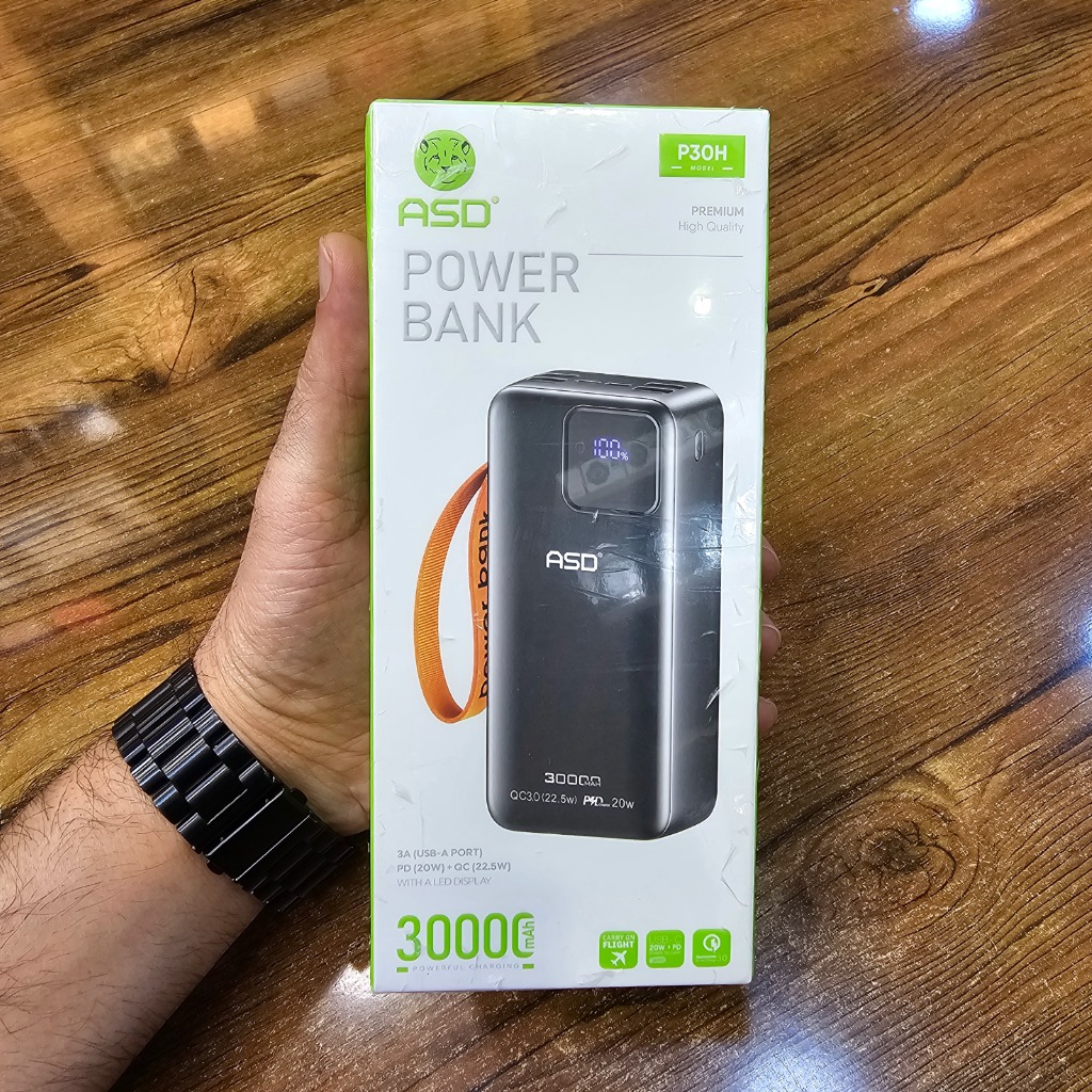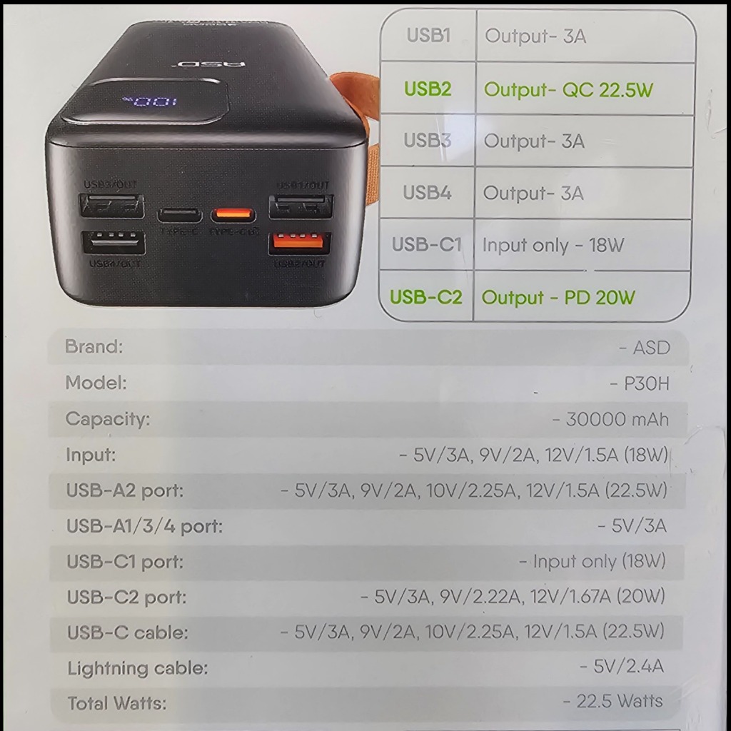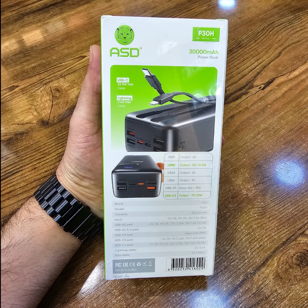 با کیفیت ترین پاوربانک 30000مجهز به انواع پروتکلهای شارژ سریع و ایمن PD و QC3.0 است که دارای 6 درگاه است ( 4 درگاه USB دو درگاه USB-C ) که می توانید چهار تا شش دستگاه را به صورت همزمان شارژ کنید.توان خروجی های پاوربانک 30 هزار 22.5 وات و 20 وات مخصوص آیفون است که از استانداردهای فست شارژ و فناوری PD و QC بهره میبرند و میتوانند گوشی شما را با سرعت بالا شارژ کنند.از مزایای این پاوربانک ASD